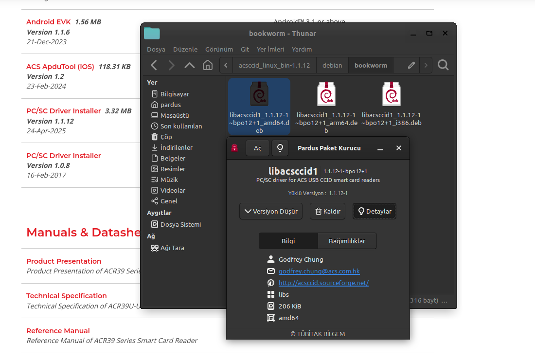 Buradan da sitesindeki Linux sürücüsü indirilebilir: https://www.acs.com.hk/en/driver/302/acr39u-smart-card-reader/