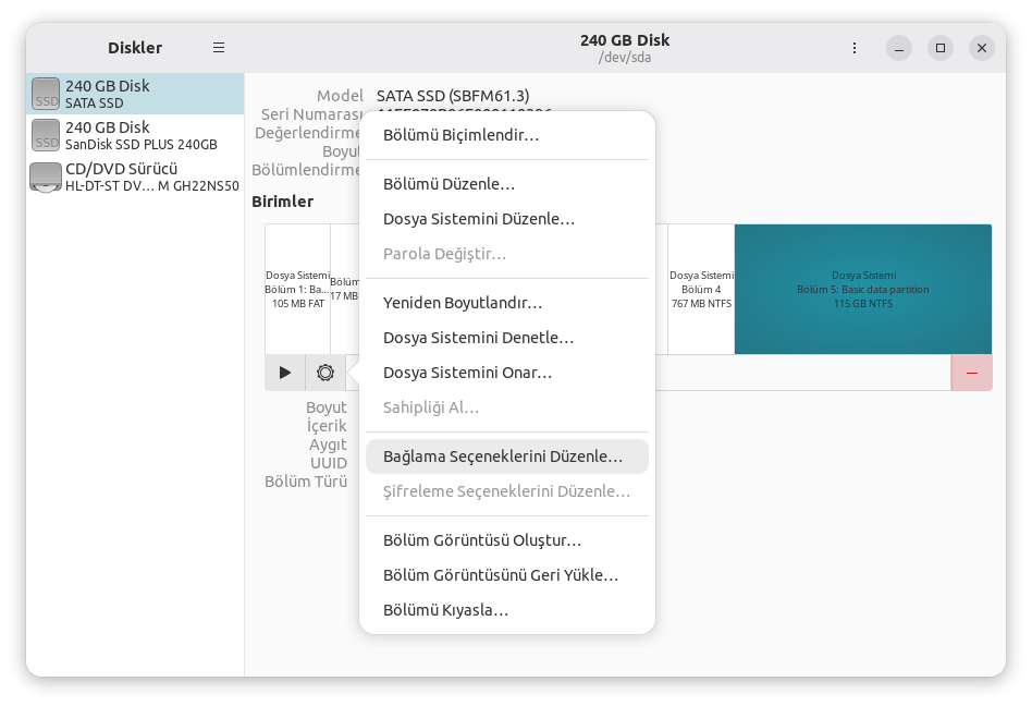 Diskler uygulamasındaki bölüm üzerinde sağ tıklayarak Bağlanma Seçeneklerini Düzenle kutusuna ntfs-3g parametresini ekleyerek deneyin.