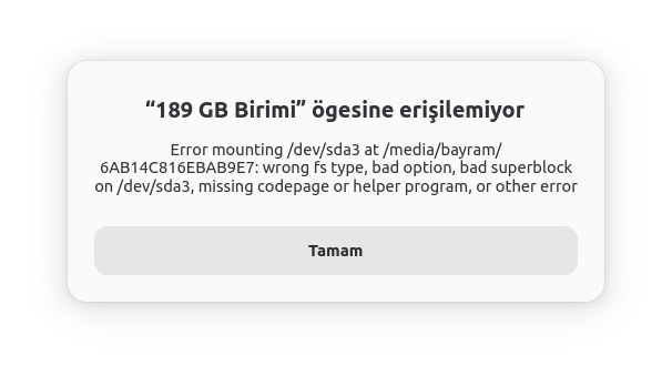 Diskte Yazılarım var. Epey kullandım. Amaşimdi bağlı değil diyor ve bağlanmıyor. Diskin bilgi kısmında “dosyası için gerekeli paketlerin listesi ntfs-3g / ntfsprogs” yazıyor. Diskte yazılarım var.