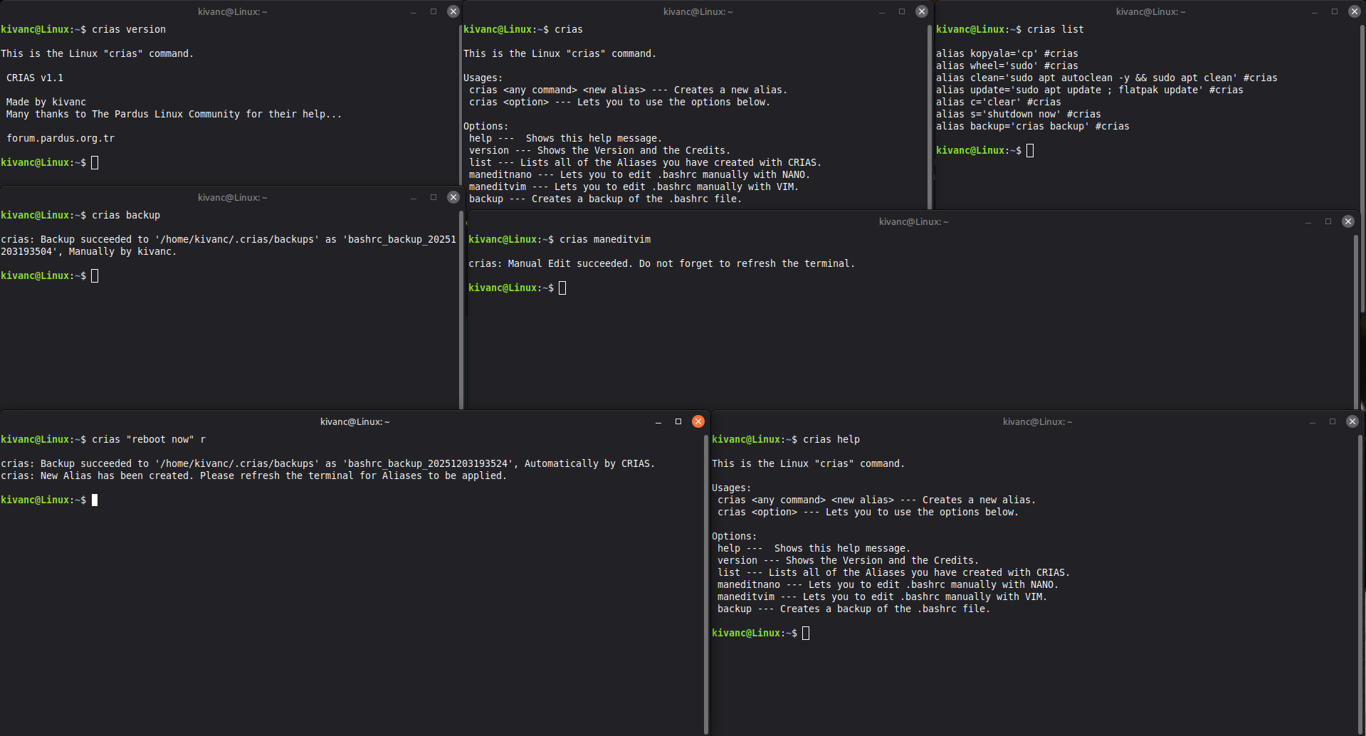 CRIAS, GNU/Linux işletim sistemlerinde ~/.bashrc dosyasının sonuna bir takım Kısayol (diğer adıyla Alias) satırları ekleyerek Uçbirim kullanımını hızlandıran ve kolaylaştıran, kendi yazdığım açık kaynaklı ve özgür bir Python betiğidir.