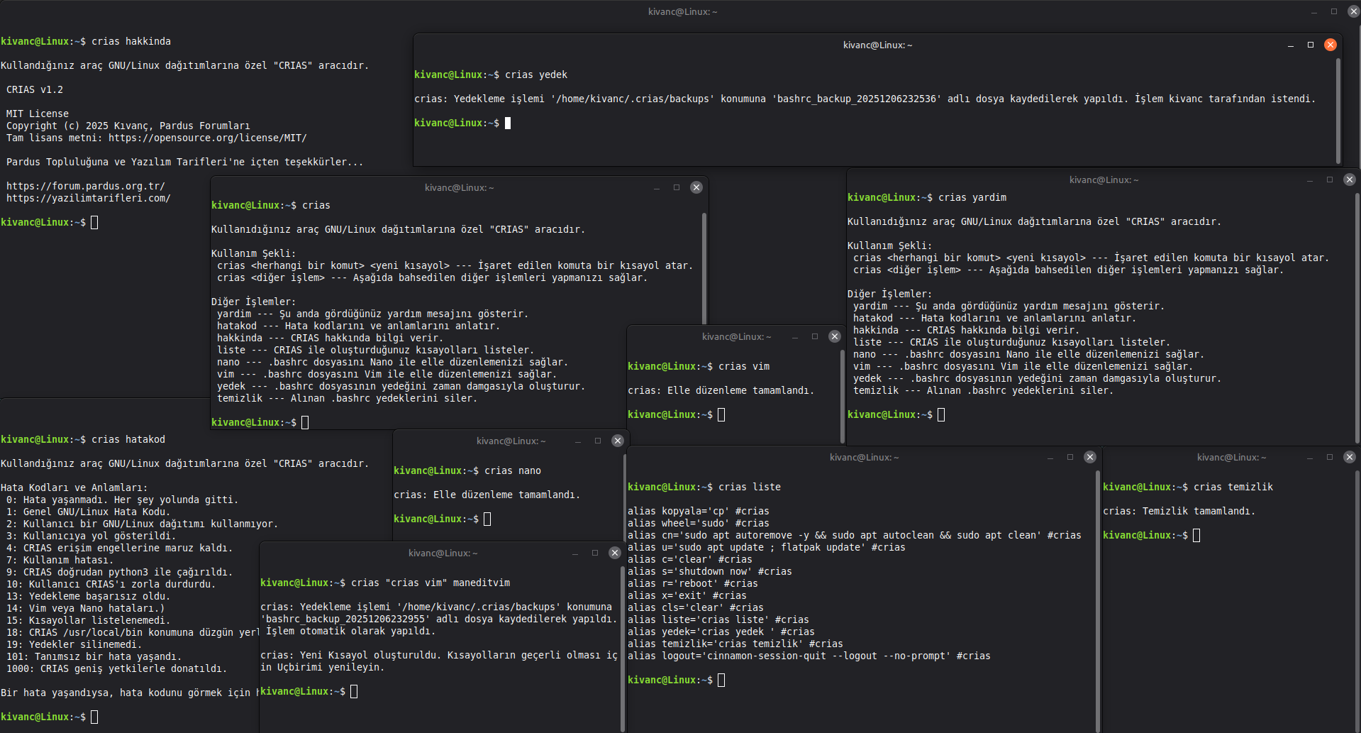 CRIAS’ı geliştirmek hayatımda yaptığım en iyi şeylerden biri oldu. Çok keyifliydi ve beni çok geliştirdi. Ama artık fark ettim ki bunun bir geleceği yok. Ne umursayan var ne de kullanan. Zaten Alias eklemek aslına bakarsanız çok kolay bir şey. Ben de zaten bunu fark edip CRIAS’ı sadece Alias ekleme aracı değil, aynı zamanda daha gelişmiş ve daha büyük bir betik yapmaya çalıştım ve kısmen de başarılı oldum. Sadece Alias eklemekle kalmıyor, onları görüyor, kontrol ediyor, yedekliyor… Veya .bashrc’nin yedeklerini alıyor. Belki zaten bunlar da pek bir işe yaramaz ve gereksizdir. Ayrıca Python’un ne kadar kısıtlı bir dil olduğu gerçeğiyle yüzleştim. Her şey gibi onun da benim de belirli sınırlarımız var ve bu sınırlar kalkmaz, kaldırılamaz. Evrenin kırıntısı bile olamayacak ömrümün, bu sefer de ömrümün kırıntısı bile olamayacak bir buçuk haftamın çoğunu CRIAS ile geçirdim ve bundan memnunum. CRIAS’ı yazarken AI’a pek başvurmadım, ondan kod isteyip kopyala yapıştır yapmadım. Ama aynen bu kopyala-yapıştır “yöntemiyle” CRIAS benzeri Terminal Arayüzlü CLI araçlarının çok daha kısa sürede çok daha kaliteli şekilde yapılmasından da nefret ediyorum. Neyse, çok boş konuştum.