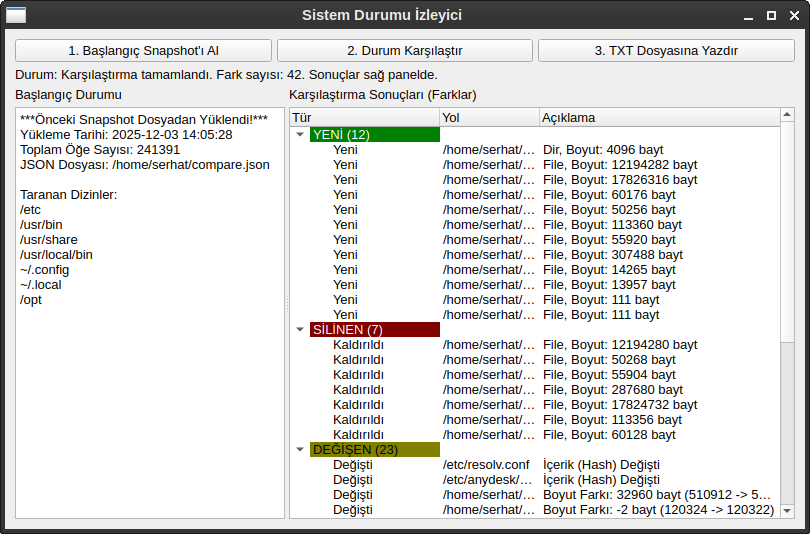 Bu program ne yapıyor: Kendisine belirtilmiş sistem dizinlerini tarayarak değişiklikleri kaydediyor. Yeni klasör var mı? Yeni dosya var mı? Var olan dosyalarda boyut değişikliği olmuş mu? Silinen var mı?