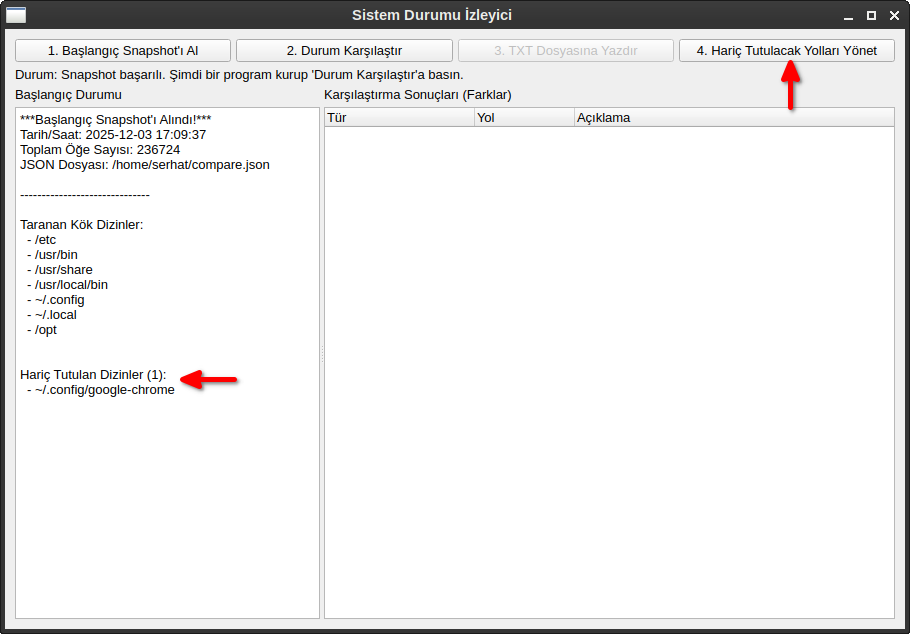QMessageBox.warning(self, "Uyarı", "Hariç tutma listesi değişti. Yeni ayarlarla doğru karşılaştırma yapmak için lütfen **yeniden 'Başlangıç Snapshot'ı Al'** düğmesine basın.")