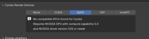 problemin asıl sebebi 3 şeyden biri sürücünüz yüksek ihtimalle Optix ile tam uyumlu değil sürümünüz çok yeni veya beta olabilir Blender ile tam stabil olmadığından dolayı böyle uyarı veriyor olabilir. Blender genelde LTS daha stabil driveri seviyor çünkü.