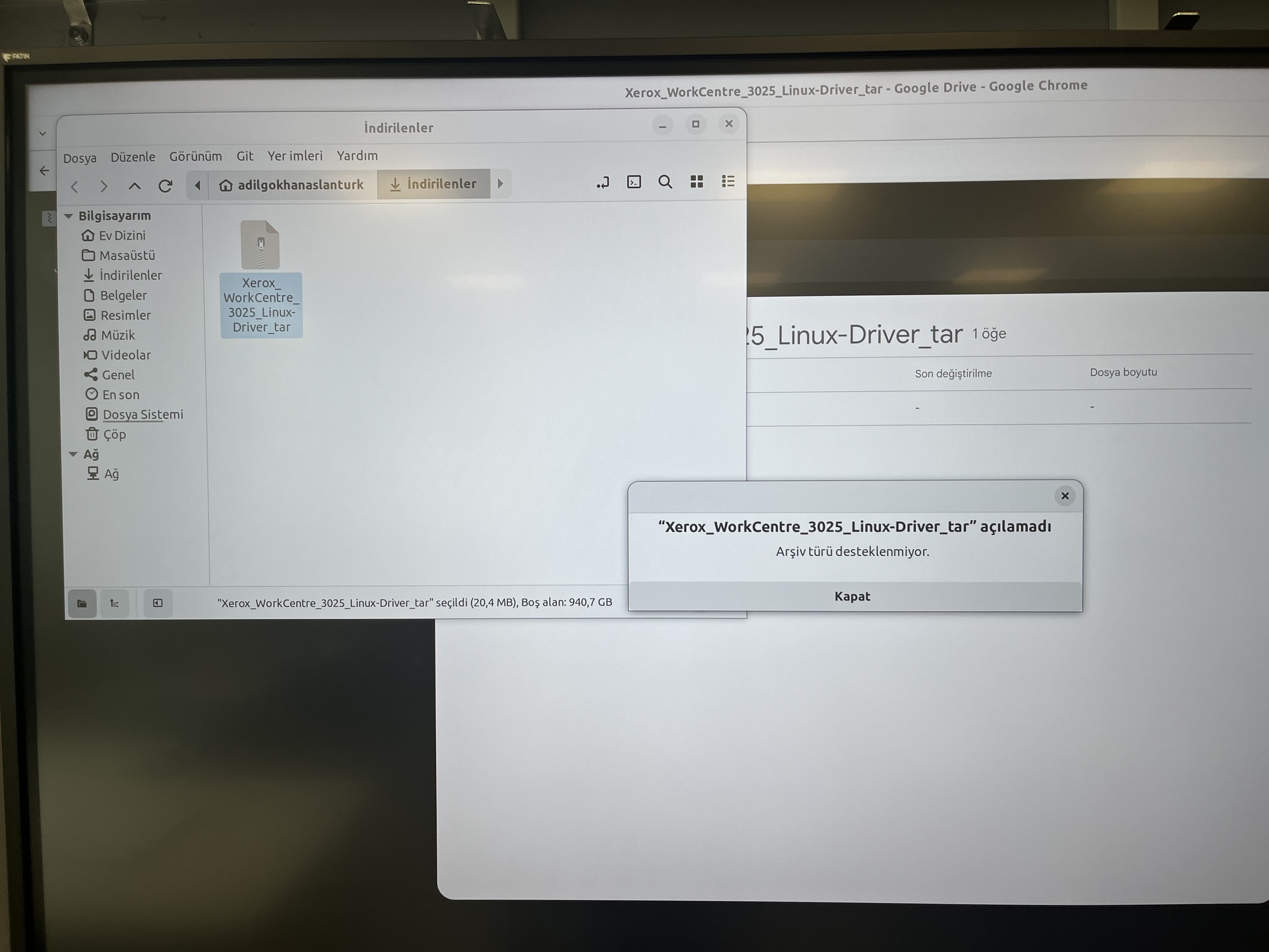indirdiğiniz dosya adını bu şekilde Xerox_WorkCentre_3025_Linux-Driver.tar yapın . Yani indirdiğiniz dosyanın sonundaki _tar silip .tar olarak değiştirip arşivden çıkarın .