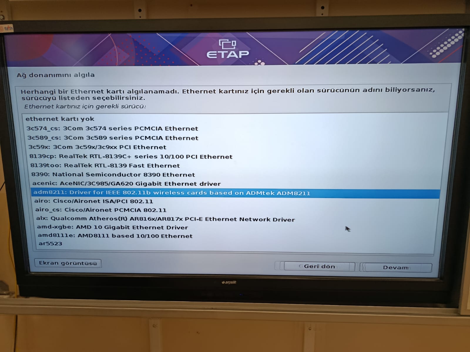 Faz-3 akıllı tahtamıza etap 19 yüklerken (grafik arayüz ile) yüklerken herhangi bir ethernet kartı bulunmadı diyor ve birsürüde ethernet driver’i var.Ne yapmalıyım?