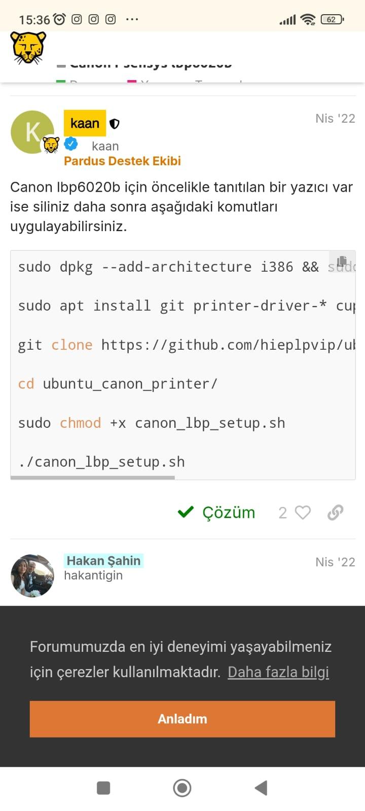 Faz2 tahtaya etap23 kurulumu yaptım. Canon LBP6020B Yazıcısının sürücüsünü kablo ile calıştırmama rağmen cıktı alamadım olabilecek bütün ihtimalleri denediğimi düşünüyorum Pardus destek ekibinde paylaşılan komut sistemlerinide denedim yine çözüm bulamadım ACİL YARDIM!!!