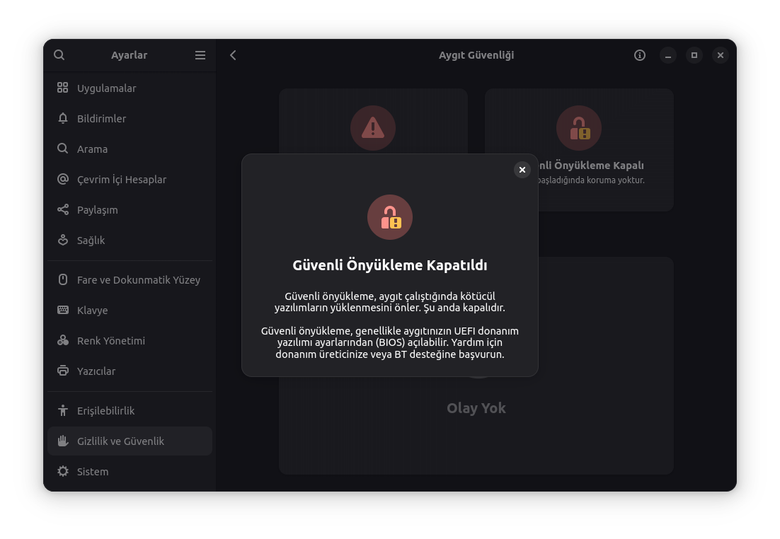 secure boot kapalı olsun diyorsunuz ama kapatınca da pardus güvenli önyükleme kapalı diye uyarıyor sonra