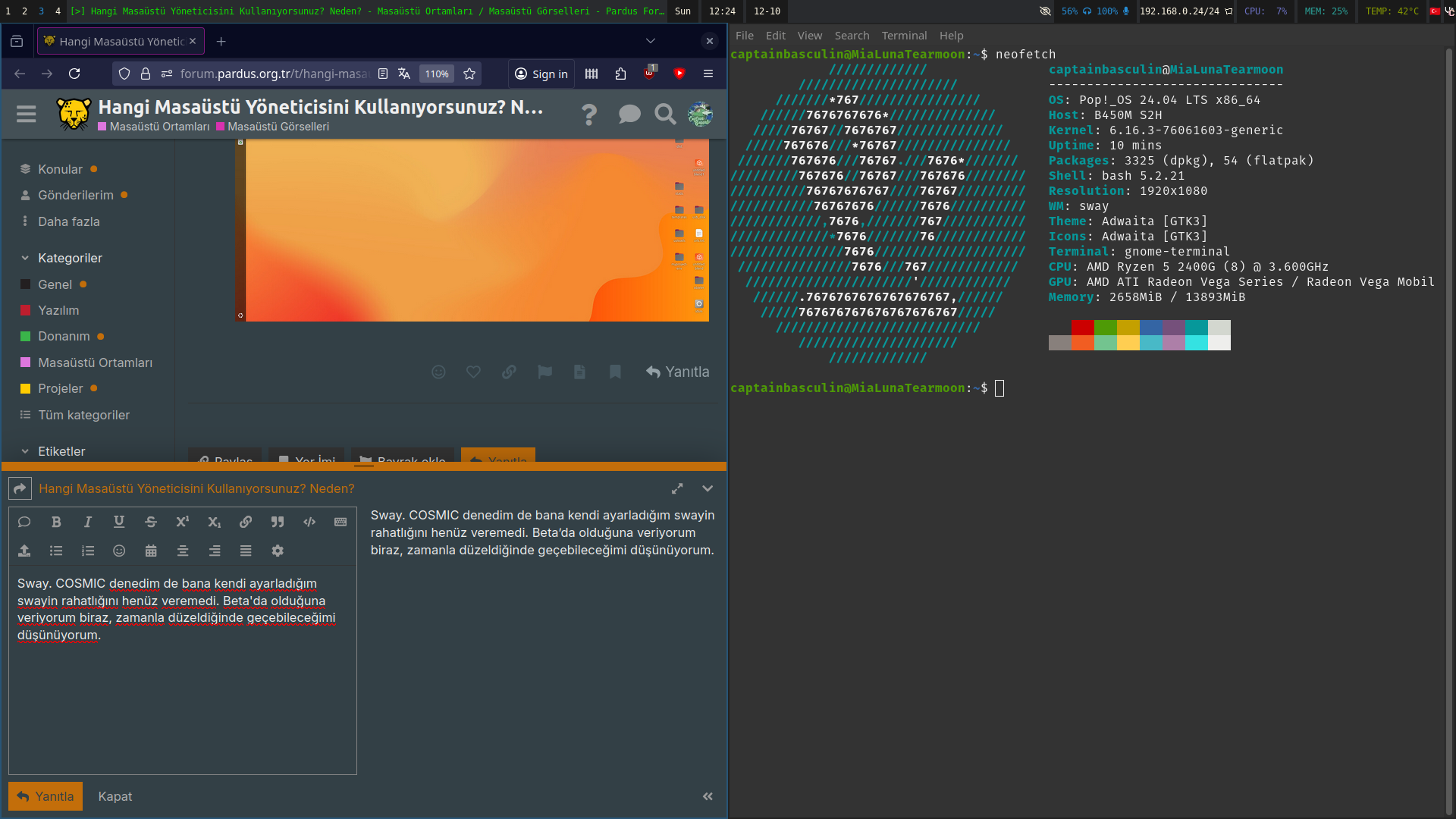 Tiling sistem kullanmayıp denemek isteyen birine sway yerine şu an cosmic’i beta olmasına rağmen öneririm, sway’de kendim config düzenleyip eklemem gereken bir çok şey cosmic’te sıfır uğraş ile çalışıyor, kendi ayarları ile birçok şeyi düzenleyebiliyorsun.