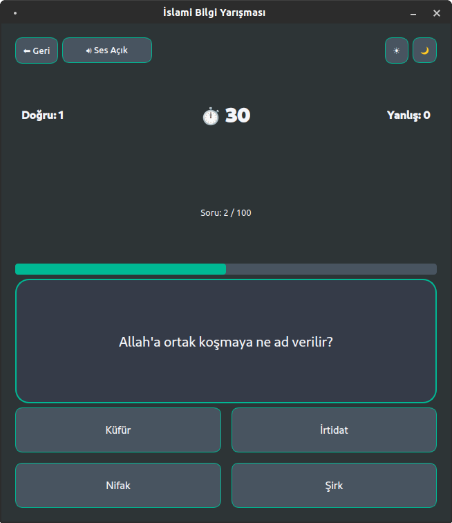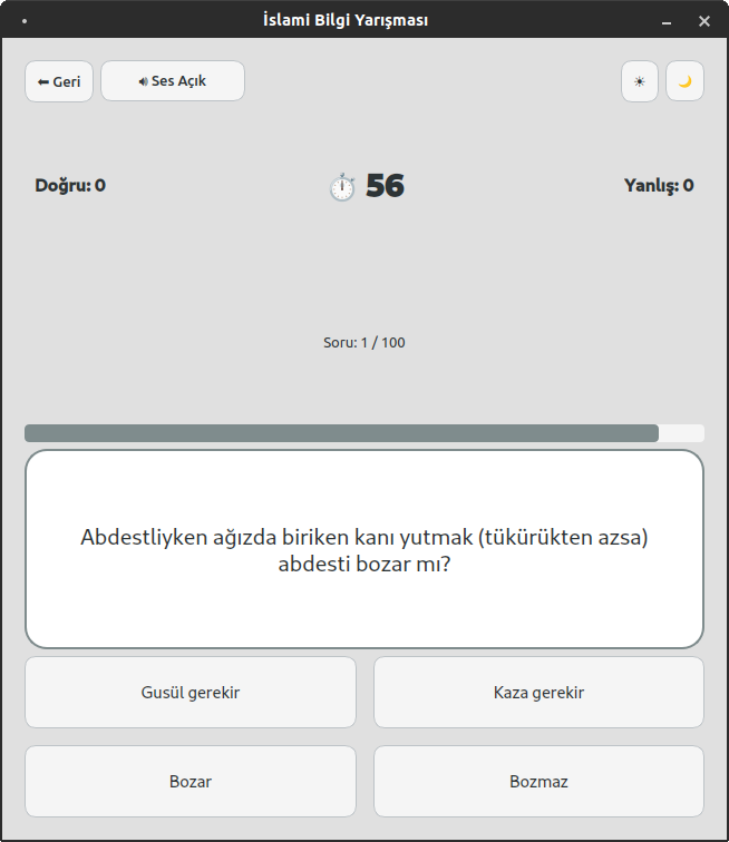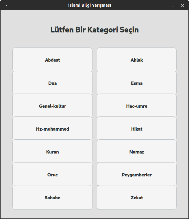 14 İslami Kategori ve her kategori için 100 adet soru bulunan toplam 1400 adet soru kapasiteli.