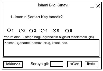 Soru ekranda görünür, altında a, b, c… diye radyo kutucukları görünür. Bunları işaretleyip ileri butonuna basılır. Son aşamada sınavı değerlendir yaparsınız. Puanlar görünür. Hangileri yanlış, doğru yanıt ne olmalıydı, gösterirsiniz.