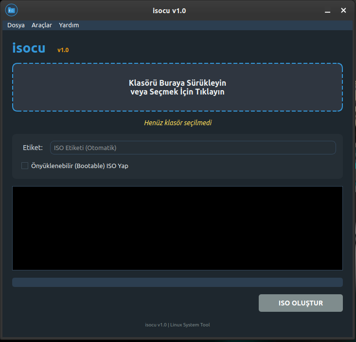 isocu, Linux (Pardus/Debian) sistemler için geliştirilmiş, klasör ve dosyalarınızı tek tıkla ISO formatına dönüştüren, modern arayüzlü ve kullanıcı dostu bir araçtır.