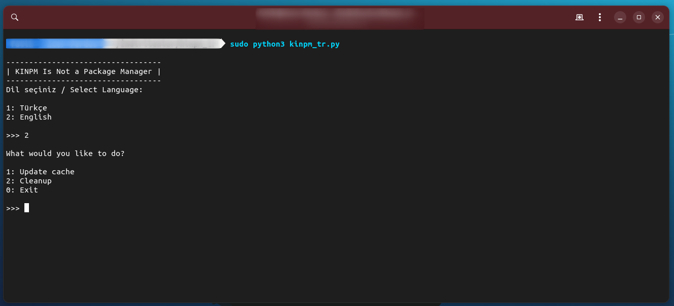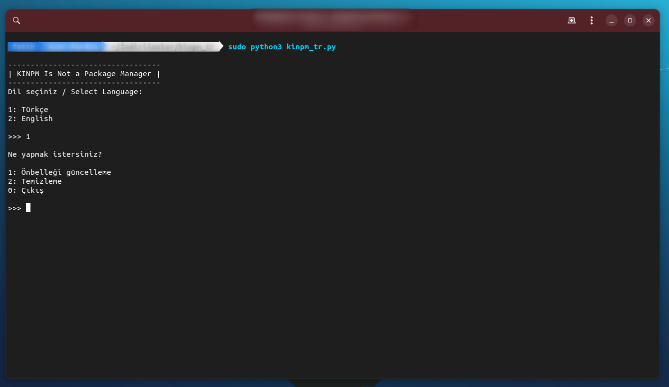 4-) Kurulumdan sonra sadece sudo kinpm yazarsanız sudo apt update, sudo apt upgrade, sudo apt autoremove ve sudo apt clean ile tek tek uğraşmanız gerekmez.