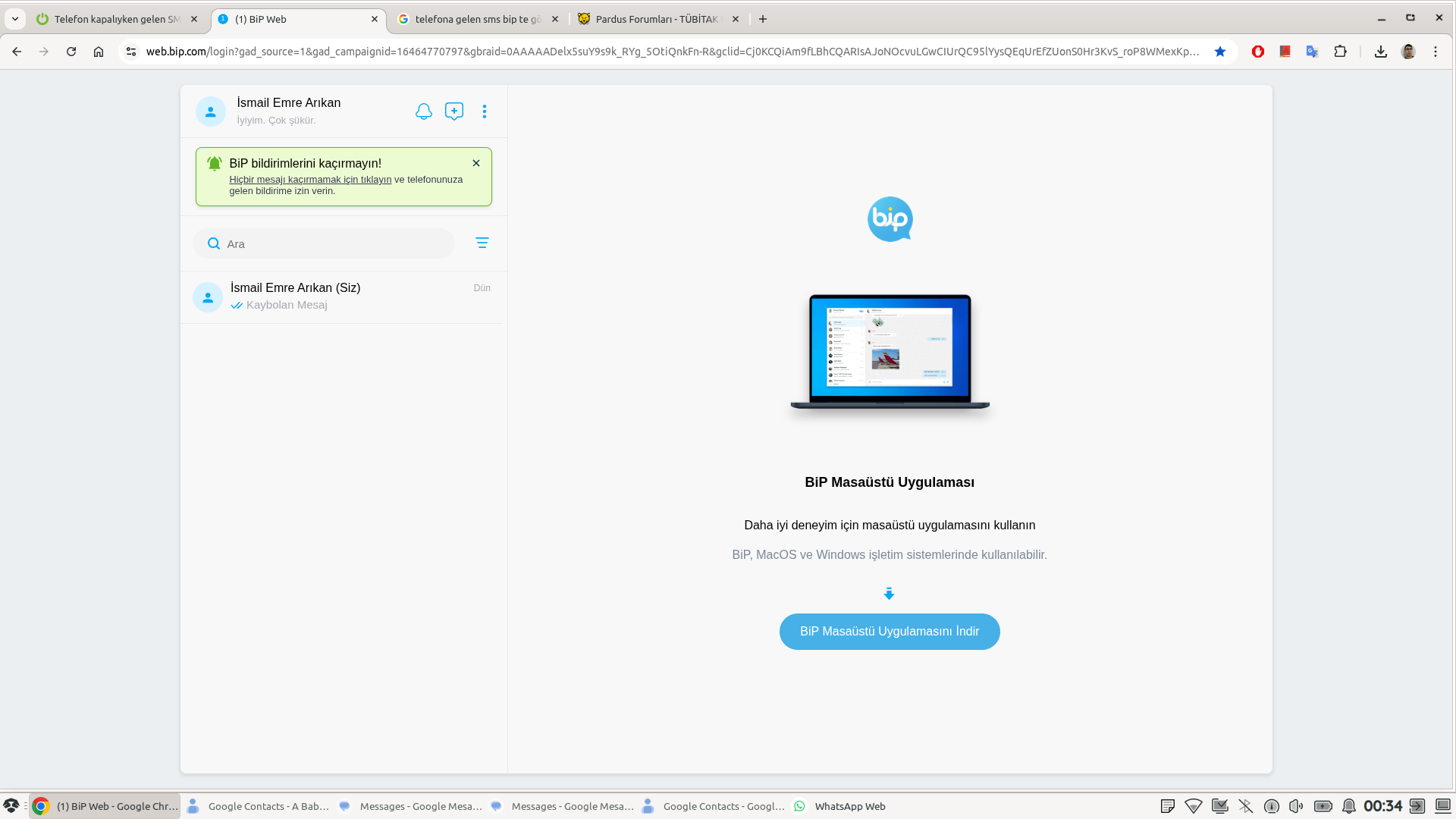 4- BİP Web üzerinden de aynısını yapın. Bip’te masaüstüne yükleme seçeneği açılmadığı için durum mesajımı telefonumdan paylaştım. Tarayıcıyı kapatıp yeniden açsanız da Bip çalışıyor güzel. ![]()