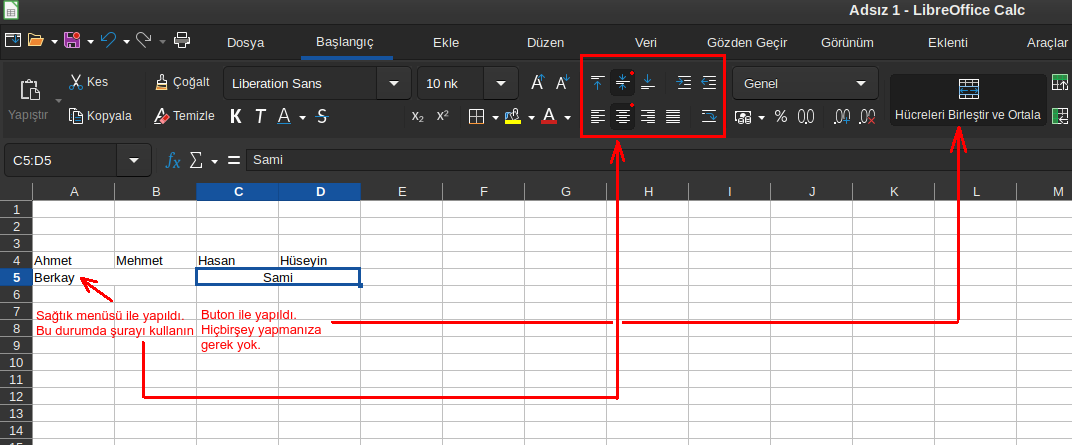 SORUN:LibreOffice calc programında bir hücrenin satır olarak uzatılması veya birkaç hücrenin “birleştir” komutuyla bir birleştirilmesi sonucu oluşturulan hücrenin içine girilen metnin,"hücre biçimlendirme>hizalama yoluyla ortalanması komutu verildiğinde,metnin seçili hücre içinde düzgün ortalanmaması.Elle ayarlanmasının da zor olması.Düzgün ortalama nasıl yapılır?