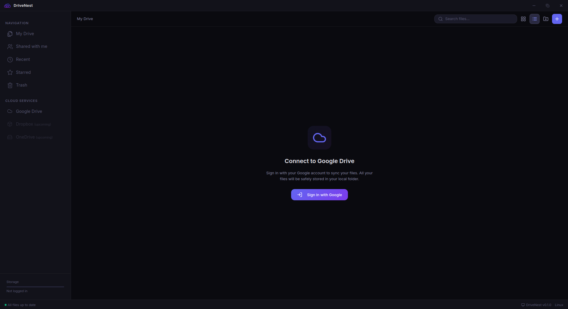 DriveNest, Linux için modern bir Google Drive masaüstü istemcisi geliştirmeyi amaçlayan bir projedir. Linux tarafında resmi bir Google Drive uygulaması olmadığı için bu eksikliği gidermeyi hedefliyorum.