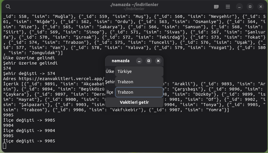 Eğer sizde terminalde bu ilçeler gözüküyorsa uygulama beklenildiği gibi çalışıyordur.