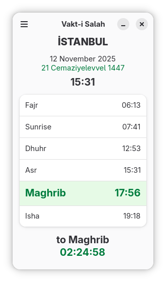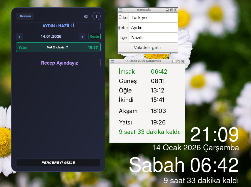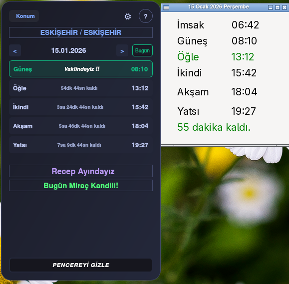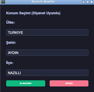 ya da kaynak kodu indirip sudo bash ./paketle_namazvakti.sh komutu ile kendi deb paketinizi oluşturup çift tıklayara ya da sudo dpkg -i namazvakti_1.0_amd64.deb ile kurabilirsiniz.