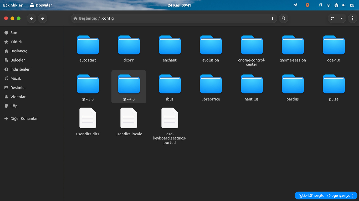 4- Hangi temayı seçeceksek, onun klasöründeki gtk4 klasorunü buluyoruz. Bunun içeriğini komple kopyalıyoruz. Sonra ~başlangıç(veya ev)/config dizini içindeki gtk4 klasörüne bu içeriği yapıştırıyoruz.