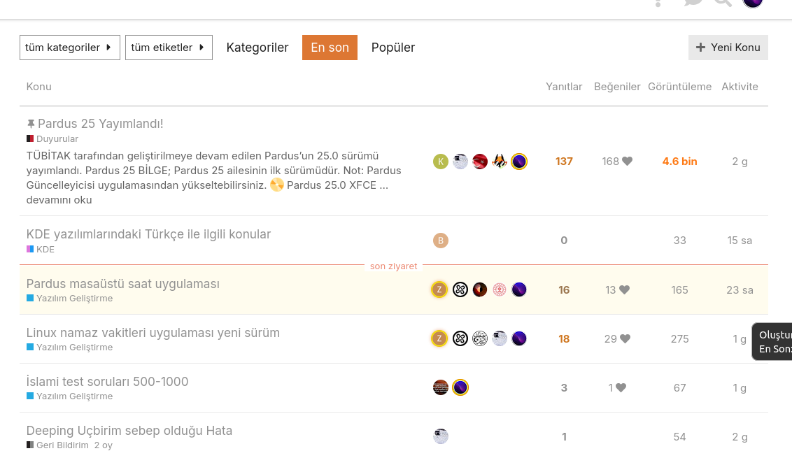 Bazı konuları görüp cevap yazıyorum. Fakat sabitlenmiş konular var. Bu yüzden yenileri çok zor görüyorum. Pardus 25 Yayımlandıyı anladım çok görüntülenmesi var ama kde yazılımlarındaki türkçe konular niye var anlamadım. Yeni konular görüp yeni faydalar sağlamak istiyorum. (Bu bir öneridir ve sizi bu özelliği kaldırtmaya zorlamıyorum.)
