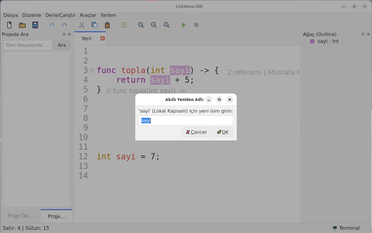 Akıllı Editör: Kapsam duyarlı (scope-aware) yeniden adlandırma, otomatik parantez kapatma ve sözdizimi hatalarını anlık gösteren (linter) bir kod editörü sunar.