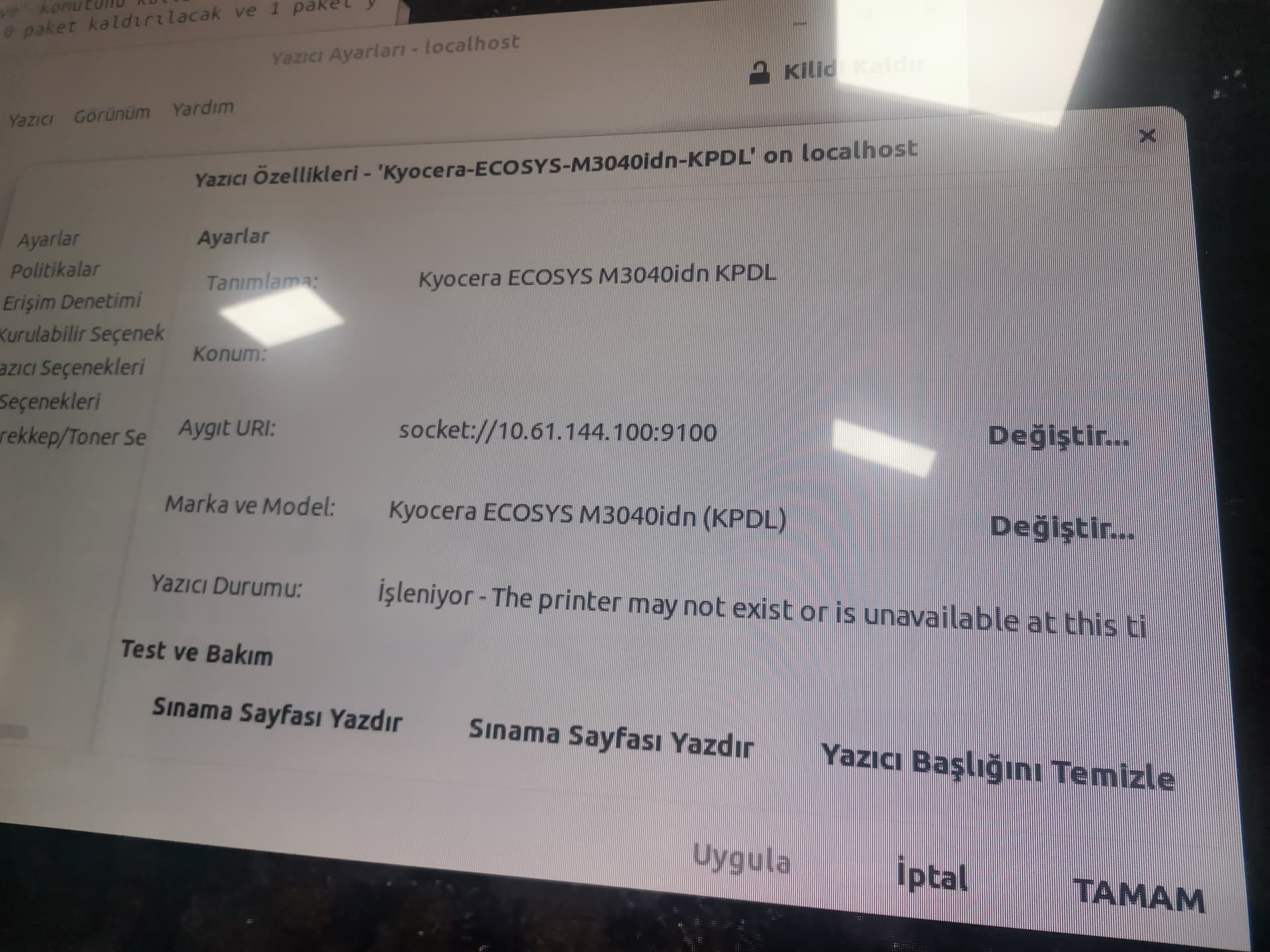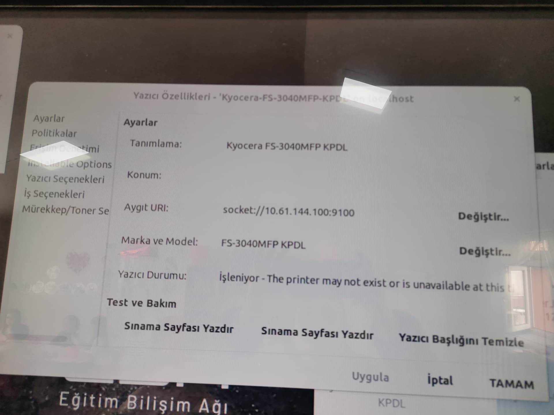Yazıcıya ağdan erişebiliyoruz sorun yokmuş. Ayarlardan yazıcı ayarlarına girin. Eklediğiniz yazıcının Özelliklerindeki sürücü kısmından PostScript seçerek deneyiniz.