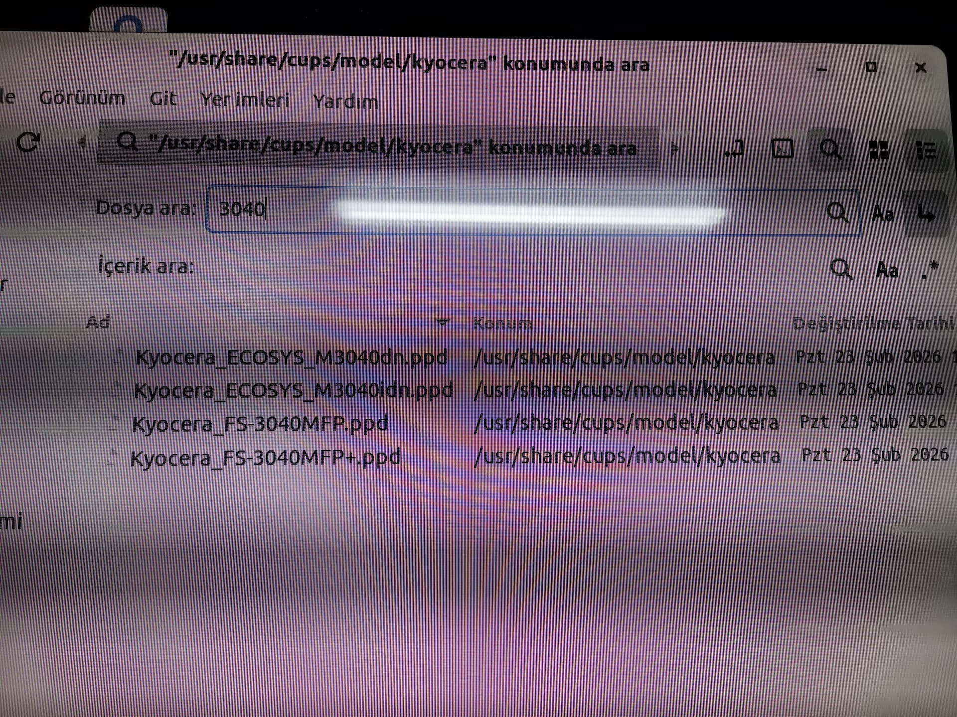 ls /usr/share/cups/model/kyocera | grep 3040 komut çıktısında yazıcı gözüküyor mu?
