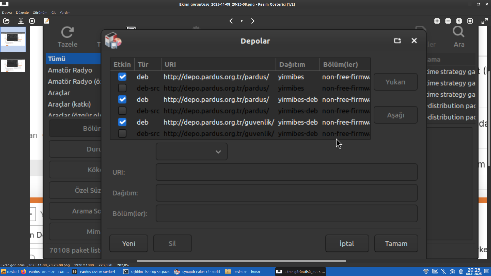 Öncelikle bilgisayardan Pardus - Sistem - Synaptic Paket Yöneticisi giriyoruz. Oradan Ayarlar - Depolar diyoruz.