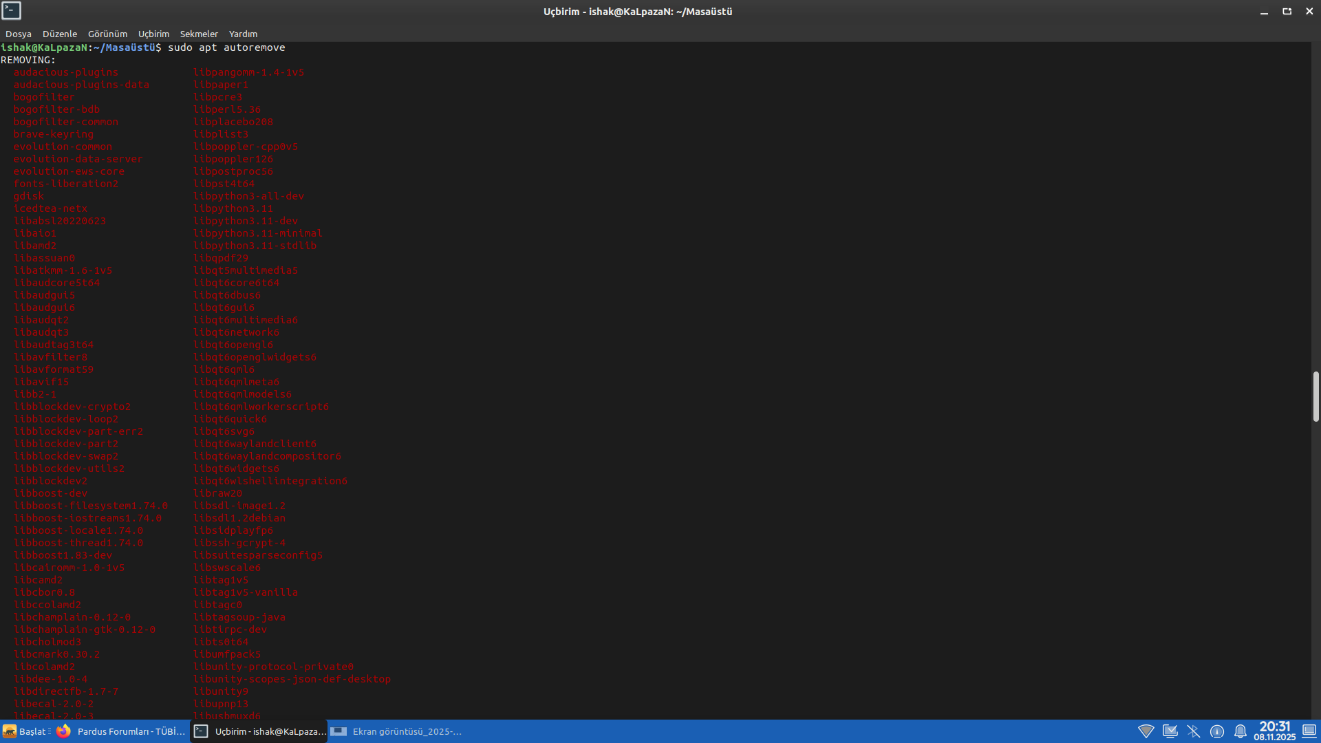 ondan sonra masaüstünde terminal ( uçbirim ) açıyoruz. Depolar güncel olduğu için şimdi otomatikmen Pardus 25.0 Depolarından versiyonlarını çekmek için hazırız.