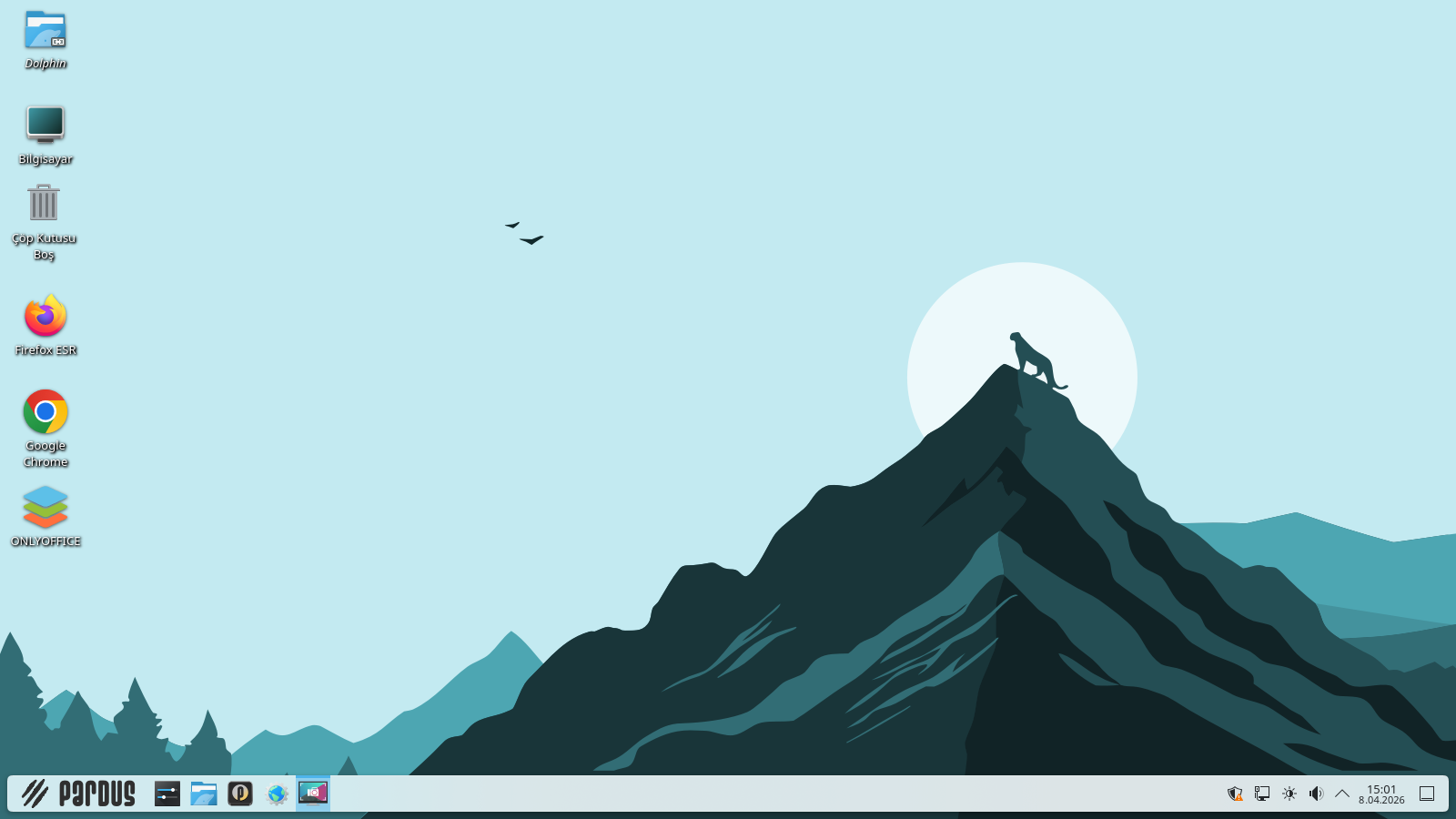 Pardus KDE, biraz değişik bir masaüstü düzeni ile… Üstteki panelin sol tarafında etkin olduğunda uygulamaların menü çubuğu yer alıyor, çöp sepeti sağdaki sistem tepsisi tarafında. Sol paneldeki Dolphin dosya yöneticisine tıklayınca ev dizini açılır.