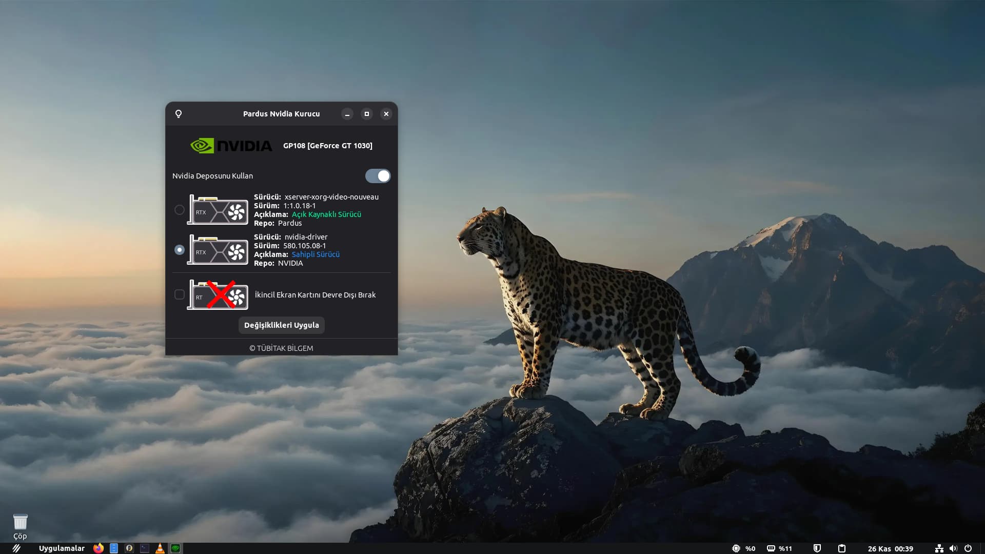 Daha önce Pardus 25 Betada iken, Nvidia’yı terminalden kurduğumda 550 kurmuş ve bir daha normal giriş yapamadığım için Pardus 25 Beta’sını silip yeniden kurmuştum!