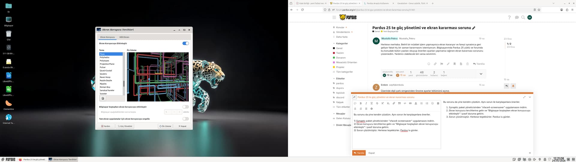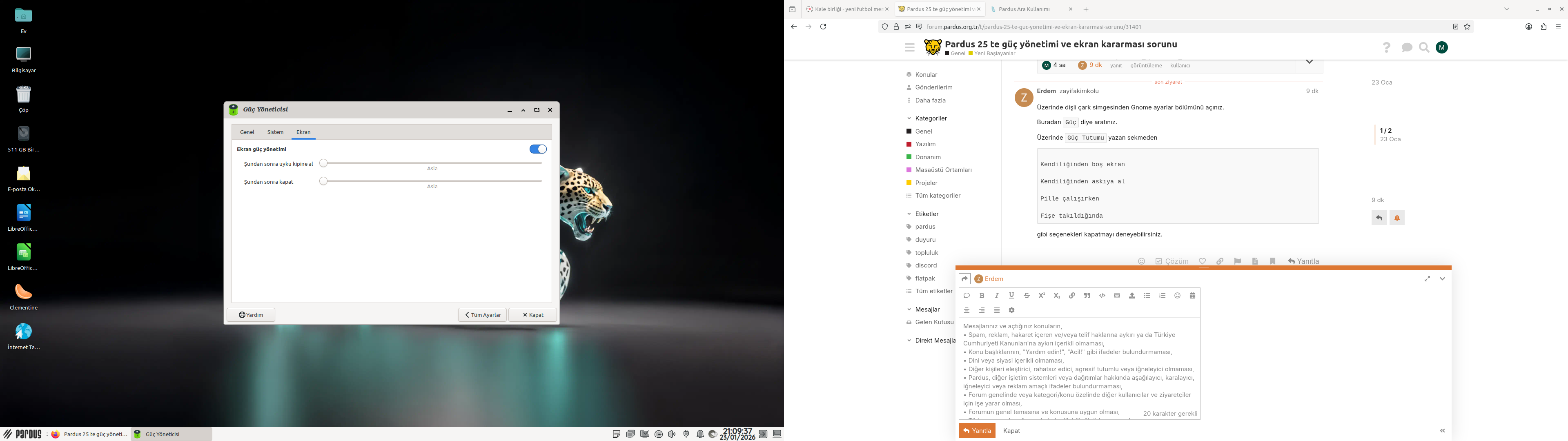 Herkese merhaba. Belirli bir müddet işlem yapmayınca ekran kararıyor ve fareyi oynatınca geri geliyor fakat hiç bir zaman kararmasını istemiyorum. Bilgisayarımda Pardus 25 yüklü ve forumda bu konudaki bütün yazıları okuyup önerilen ayarları yapmama rağmen ekran kararması sorununu çözemedim. Yardımcı olabilecek biri varsa sevinirim.