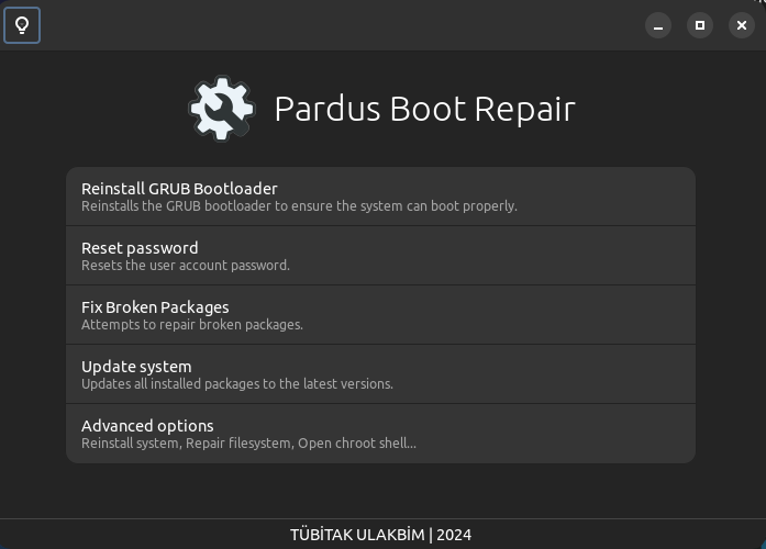 - Canlı USB ile “Pardus Başlangıç Onarma(Pardus Boot Repair)” uygulamasını açınız.