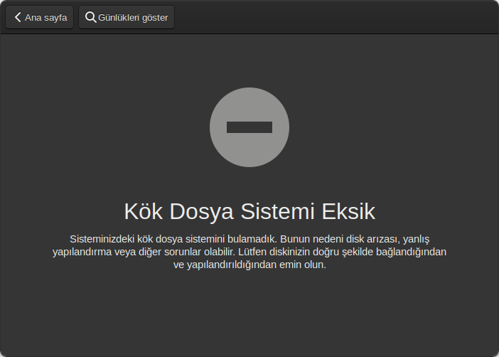 Hata Tipi: Uygulama arayüzünde “Kök Dosya Sistemi Eksik” hatası alınıyor.