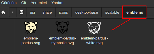 Yazılım, dağıtım logosunu Sadi bey’in bahsettiği “emblem-pardus-symbolic” olarak belirlemiş. Bu ikon bir svg dosyasıdır ve /usr/share/icons/desktop-base/ klasörünün içinde bir yerdedir. İçerikte çeşitli çözünürlükte resimler kategoriler halindedir, bunların içinde arayacaksınız. Bulamazsanız sırasıyla şu klasörlere başvurun (varsa):