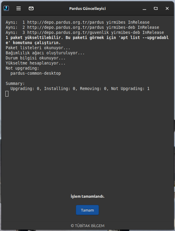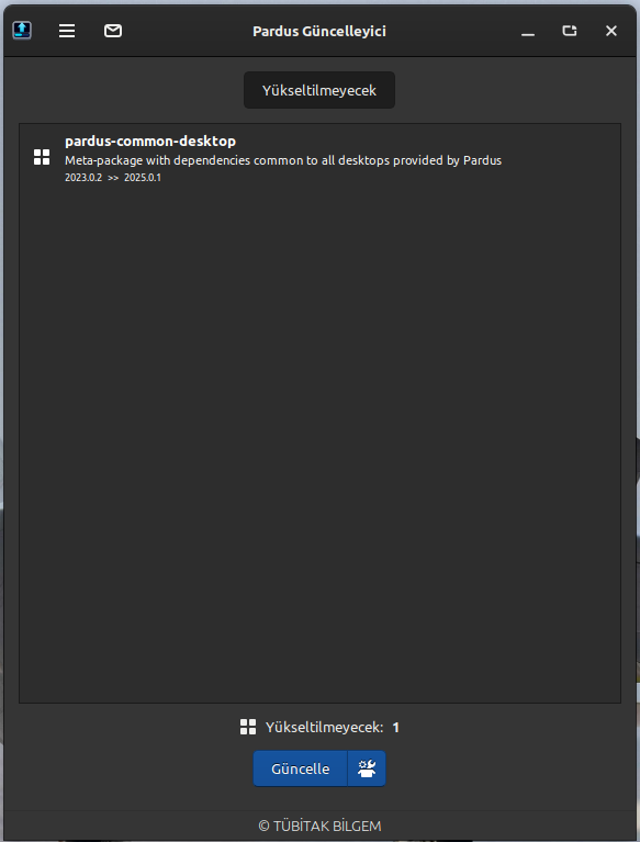 Pardus 25.0 xfce sürümüne yükseltme işlemi gerçekleştirdim. Pardus güncelleyicide güncellenecek bir paket olarak pardus-common-desktop görünüyor. Fakat güncelle dediğimde güncellemiyor.