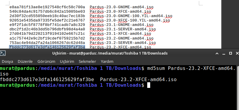 iso dosyasını indirdiğiniz sitede hash değeri vardır