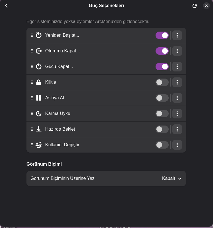 Sadece ayarlardan kapat veya askıya al olarak seçebiliyoruz ancak KDE üzerinde bu menüde yeniden başlat da vardı.