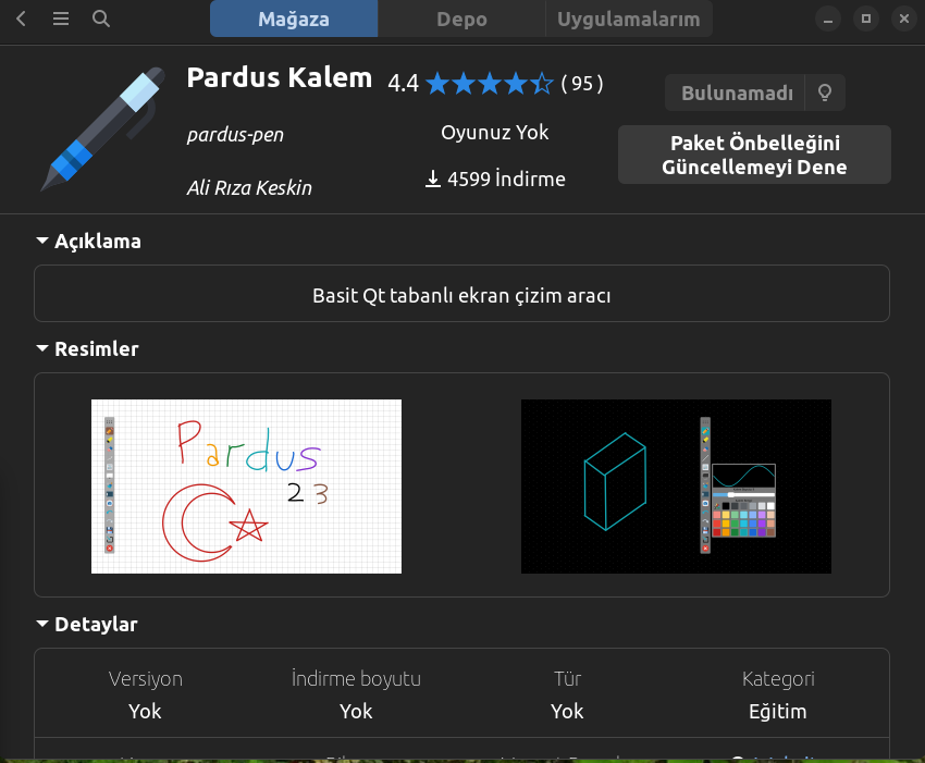 Pardüs uygulama merkezinden örneğin ‘‘Kalem’’ uygulamasını indirmek istediğimde ‘‘Paket önbelleğini güncellemeyi dene’’ uyarısı çıkıyor. Uyarıya tıklayıp devam ettiğimde ‘‘Bulunamadı’’ diyor. Sorunun çözümü için yardımcı olabilir misiniz?