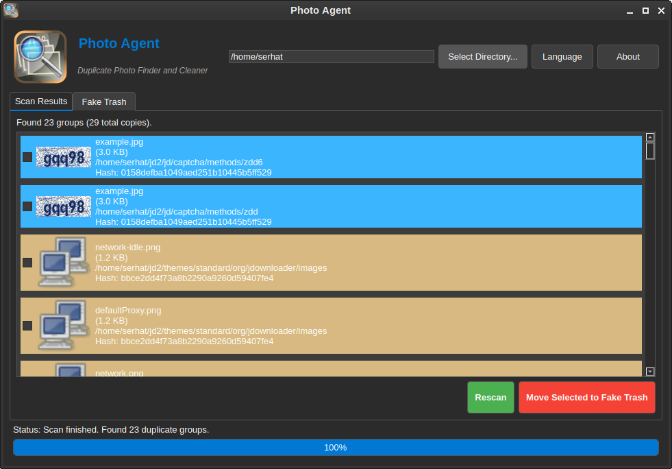 Programın kullanımı çok kolay. Yolu gösterin ve tara deyin. İstemediğiniz fazla fotoları işaretleyin ve “Sahte Çöp Kutusuna Gönder” deyin. Daha sonra sahte çöp kutusu sekmesine geçip doğru dosyaları seçip seçmediğinizden emin olun ve hepsini seçip temizleyin (artık geri alınamaz).