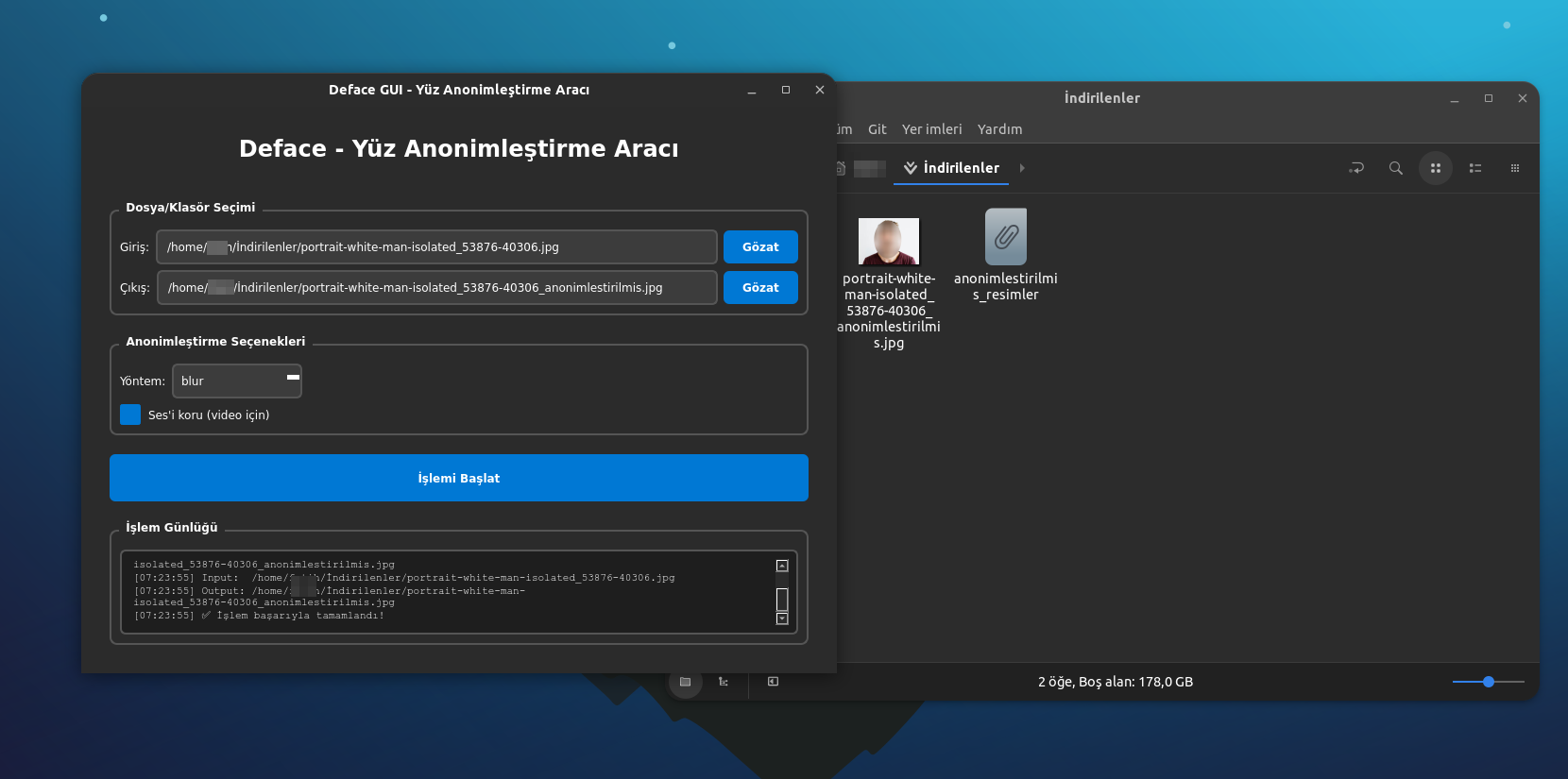 Uç birimden çalışan Deface aracı ile bir videodaki ya da klasör içindeki tüm resimlerdeki yüzleri kolayca anonimleştirebilirsiniz. Anonimleştirme işini yaparken bulanıklık, pikselleştirme ya da siyah kutu ile kapatma gibi yöntemleri uygulayabilirsiniz.