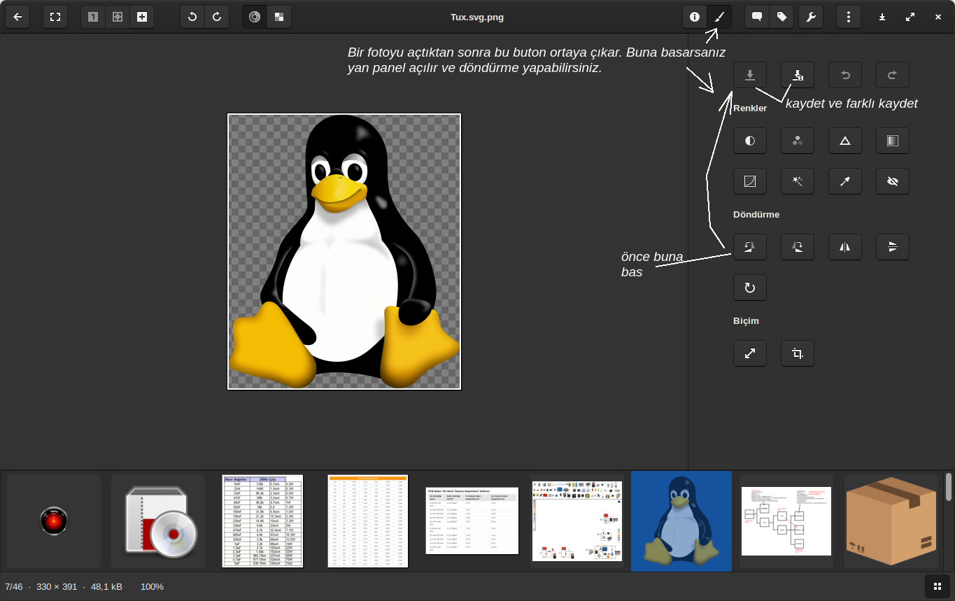 Resmi seçmeye gerek kalmadan çevir butonuna tek tıkla basarak çevirebilirsiniz. Kaydetmek için Ctrl ve S tuşlarına aynı anda basmanız yeterlidir.