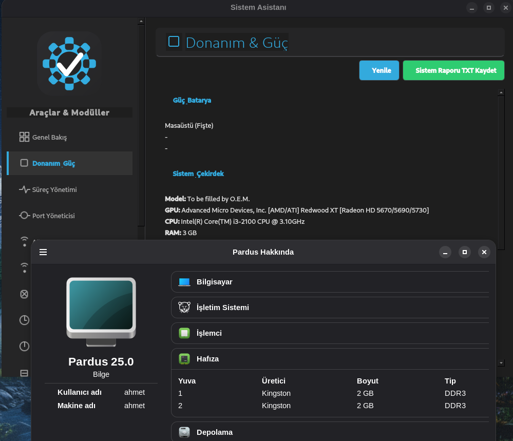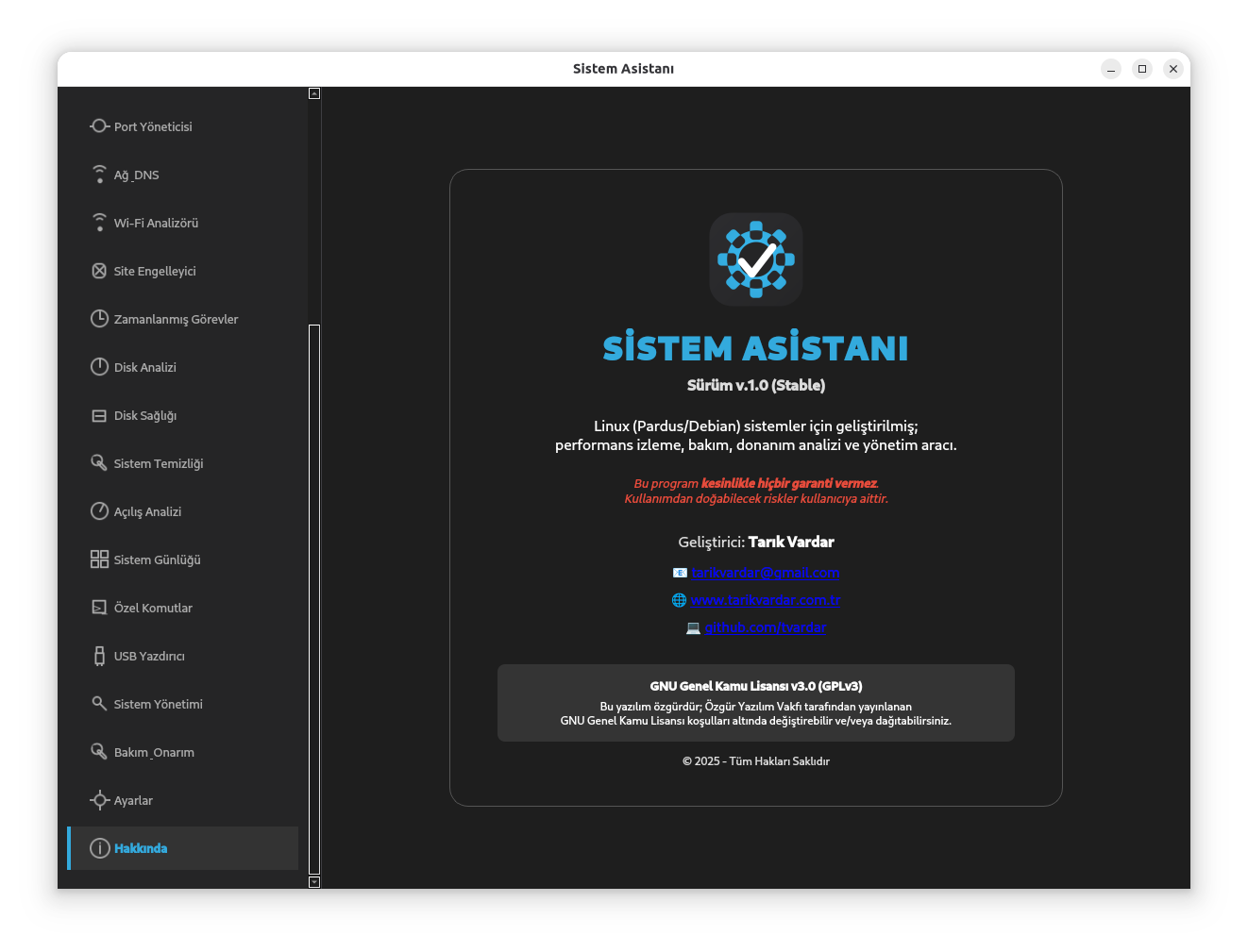 Pardus 25 (Debian 12) ve Pardus 23 (Debian 11) tabanlı Linux dağıtımları için geliştirilmiş; sistem izleme, bakım, onarım ve yönetim işlemlerini tek bir modern arayüzde toplayan gelişmiş bir araçtır.