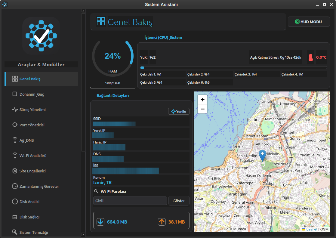 - Genel Bakış: CPU, RAM, Swap kullanımı, anlık ağ trafiği ve harita üzerinde konum bilgisi.