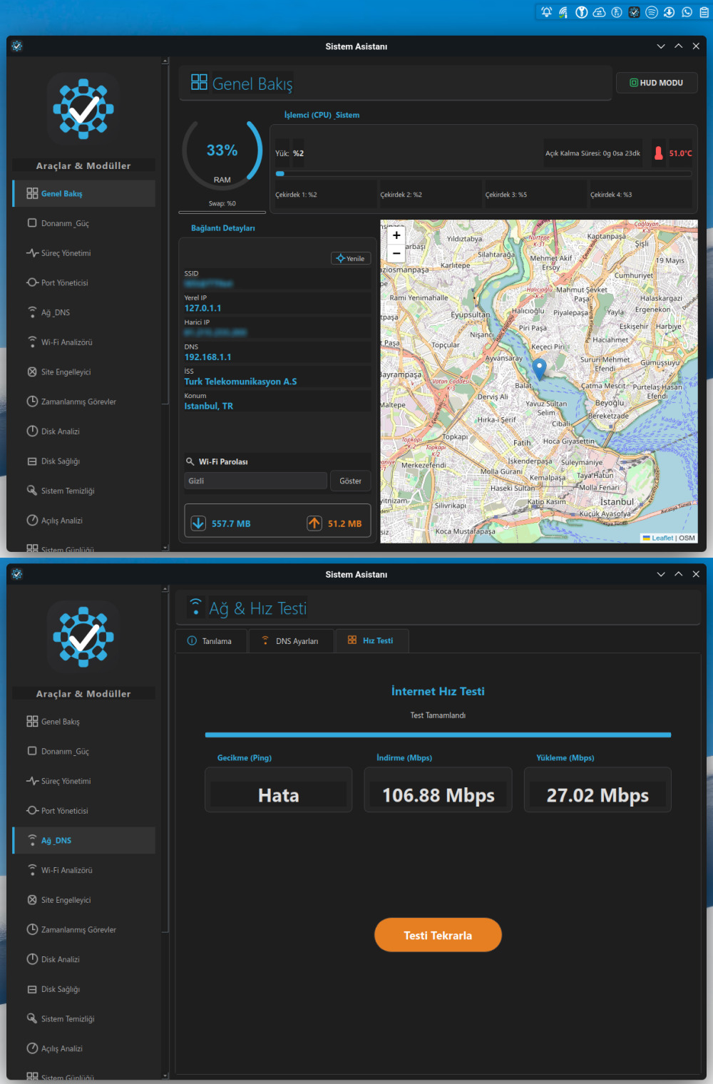 - Hız Testi: Çoklu iş parçacığı ile İndirme (Download), Yükleme (Upload) ve Gecikme (Ping) testi.