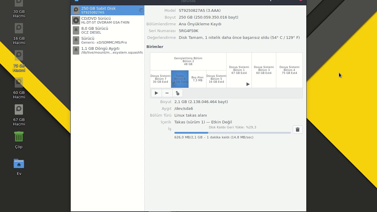 Sisteminizi kurup, programlarınızı yükledikten sonra Pardus’u çalışan olarak açıp, Başlatıcı>Diskler (asıl adı Gnome-Disk-Utility) ile yedeklerseniz, aşağıdaki videoda gösterdiğim yolla geri yükleyebilirsiniz. Bu sizi sürekli sistem kurma, program kurma ve ayarlamalar yapma zahmetinden kurtaran çok faydalı bir işlemdir. Burada dikkat edilmesi gereken, yedeği alınacak sabit disk parçasının ya da parçalarının olabildiğince az boyutlu yapılmasıdır. Böylelikle yedek alma ve geri yükleme süreleri kısa olur. Ben ikinci işletim sistemi olarak Pardus 5.1 kullanıyorum. Pardus 5.1’i nadiren kullandığımdan sabit disk parçasını 16 GB yaptım. Birinci işletim sistemim olan Pardus 17.4’ü 30 GB’lık sabit disk parçasına kurdum. Yeni sistem yüklemelerinden sonra Pardus 5.1’in açılış süresi uzamasın diye takas alanını da yedekleyip, geri yüklüyorum. Siz ihtiyaçlarınıza göre sabit disk parçalarınızı daha büyük boyutlarda ayarlayabilirsiniz.