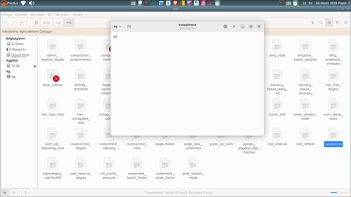Takas alanı %60 olarak ayarlı öntanımlı değer . swappiness içindeki değeri 60 yerine 99 yapıp kayıt et dediğimde hata alıyorum . Tahminimce Sys klasörünün üzerindeki kilit işareti yüzünden . İzinleri değiştirmeme bile izin vermiyor . Benmi yanlış yapıyorum bilemedim . Bir dosyayı değiştirmek için ilk önce sudo nemo yada sudo nautilus komutuyla ilgili bölüme giriyorum .