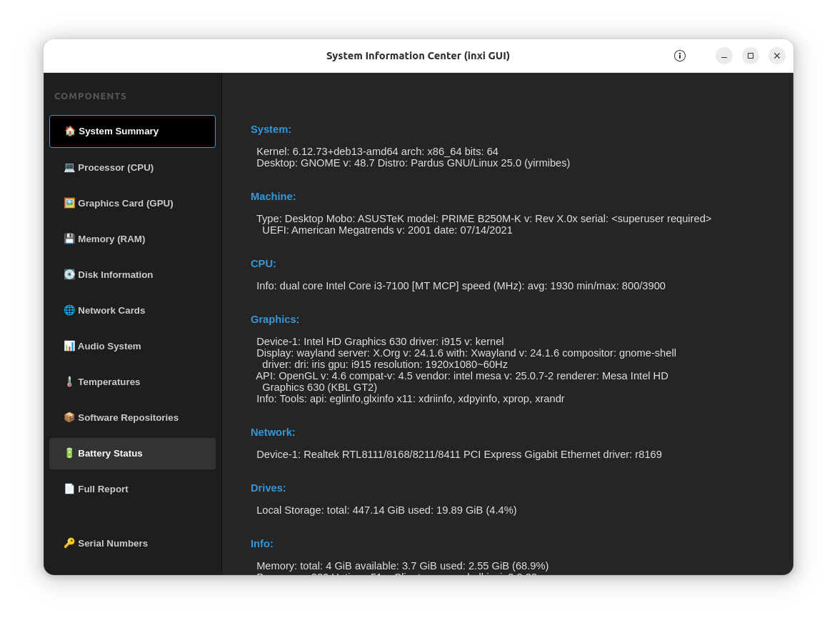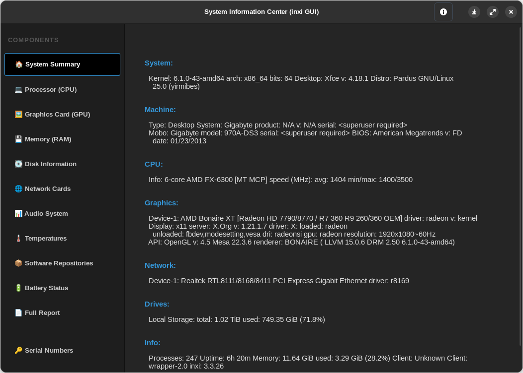 @mobilturka 'nın Inxi GUI uygulamasının çatalıdır. Sistem özelliklerini detaylı gösterir. Windows tarafındaki Piriform Speccy yazılımının linux alternatifi sayılır.