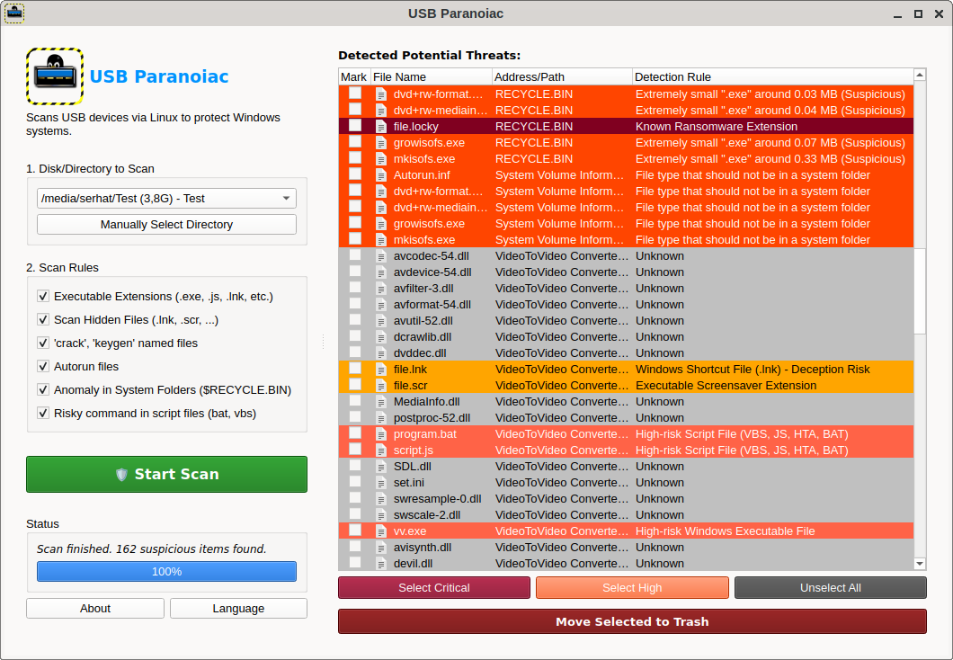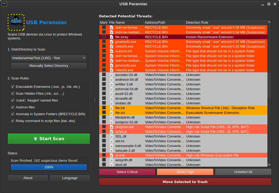 USB Paranoiac, USB flaşbelleklerde, HDD’lerde, SSD’lerde zararlı bileşen var mı diye rahatça ayıklama yapabilmeniz için renklendirme ve işaretleyip toptan silme yapmanızı sağlayan güvenlik amaçlı bir tür dosya yöneticisidir.