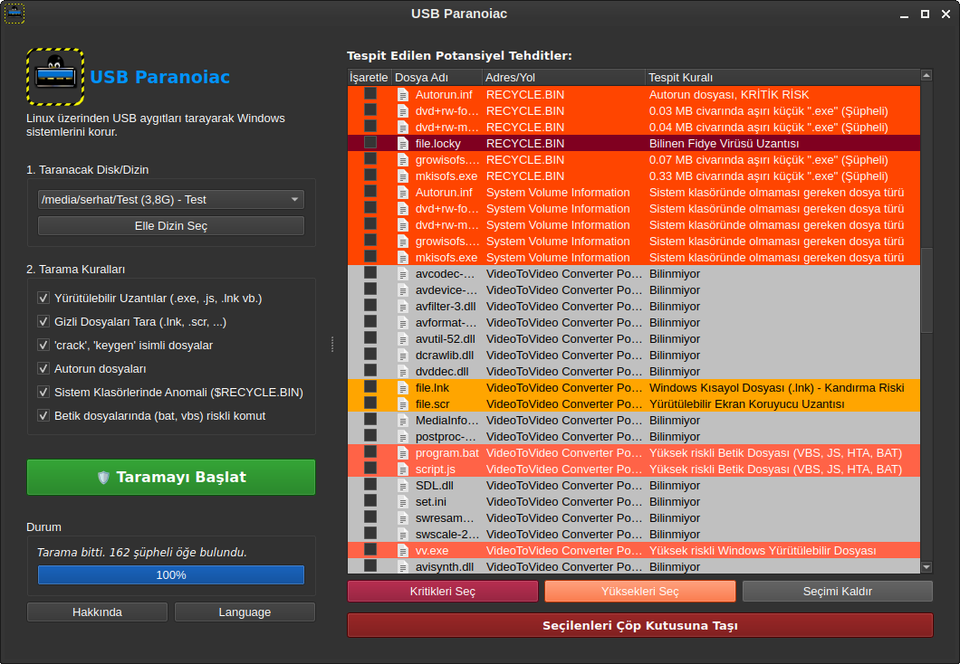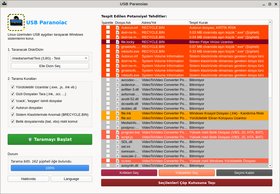 USB Paranoiac, USB yoluyla bağladığınız flaşbellekler, hafıza kartları, taşınabilir HDD ve SSD’lerinizin içini, eğer güvenli bir bilgisayardan gelmemişlerse taratarak riskli olabilecek dosyaları incelemenizi ve silmenizi sağlayan bir tür güvenlik yazılımıdır. Bir flaşı Windows’a takmadan evvel taramak içindir.